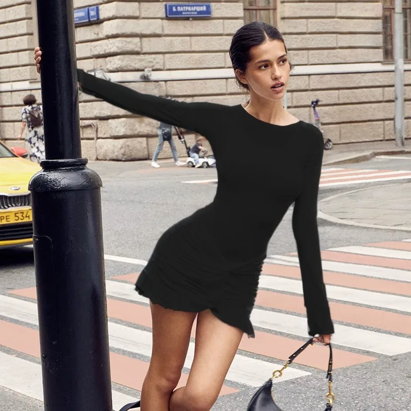 Women's Streetwear Fashion Tight Short-length Breathable Slim Dress Autumn New Elegant Solid Color Regular Sleeves Twist XL